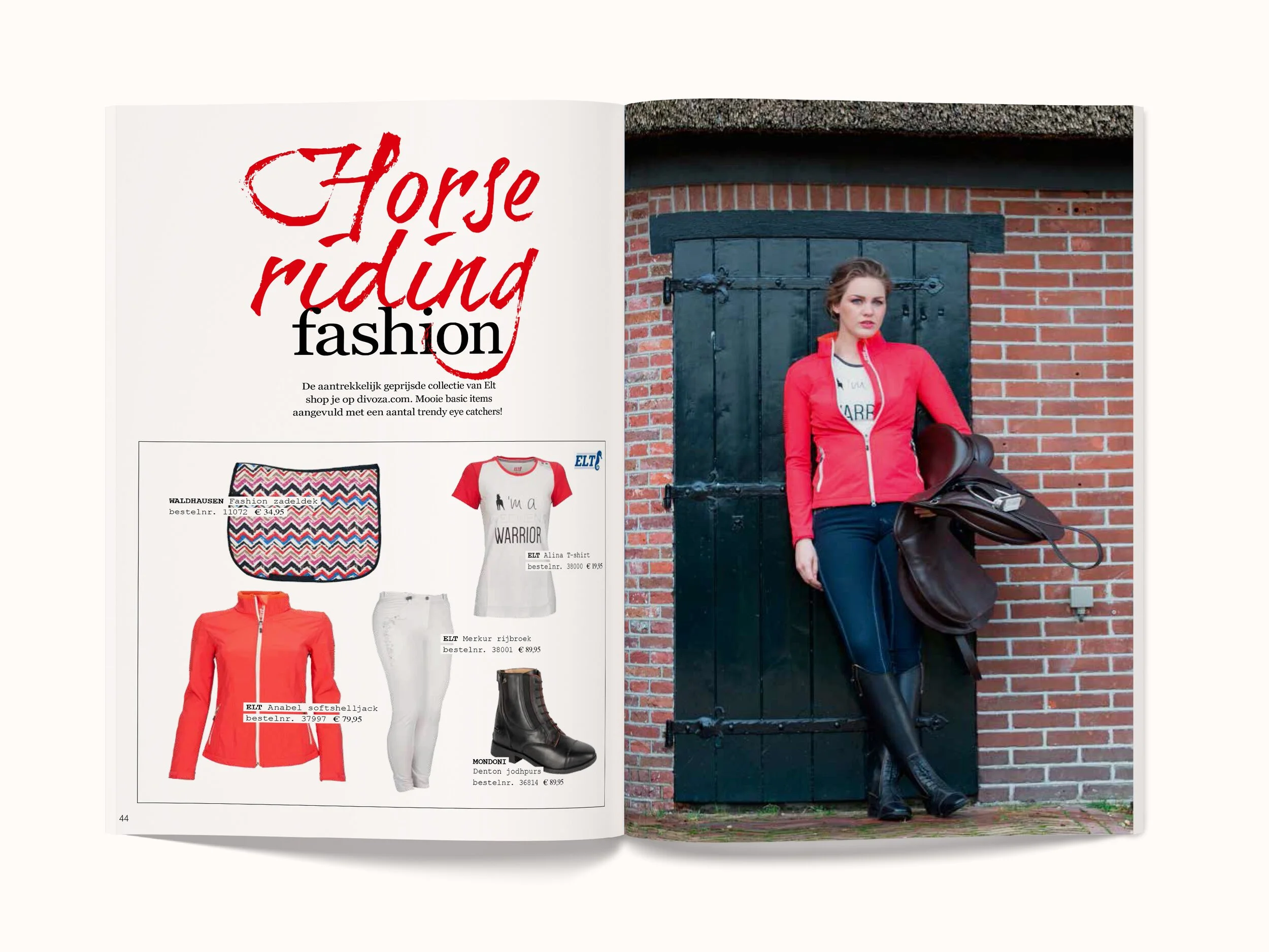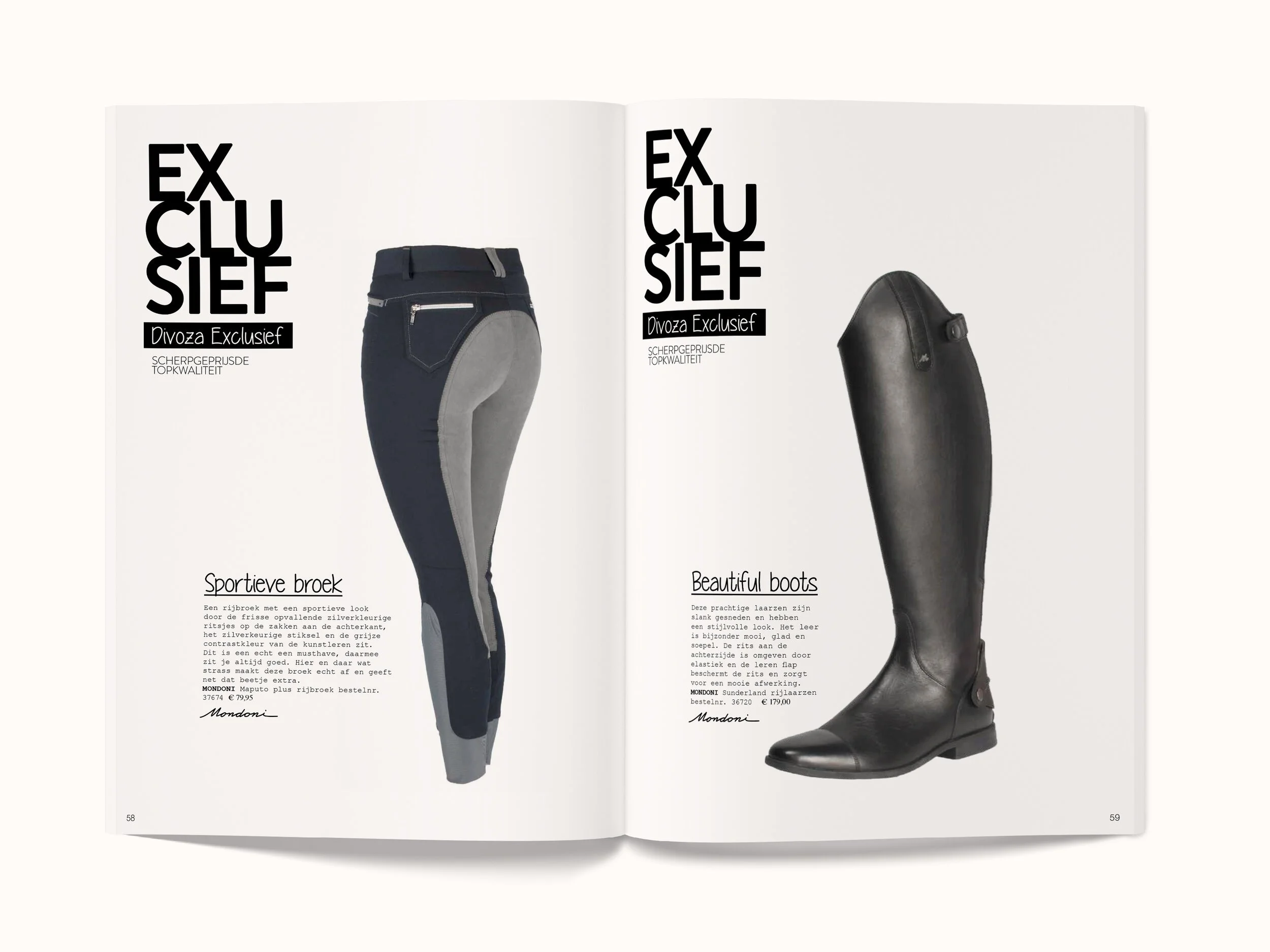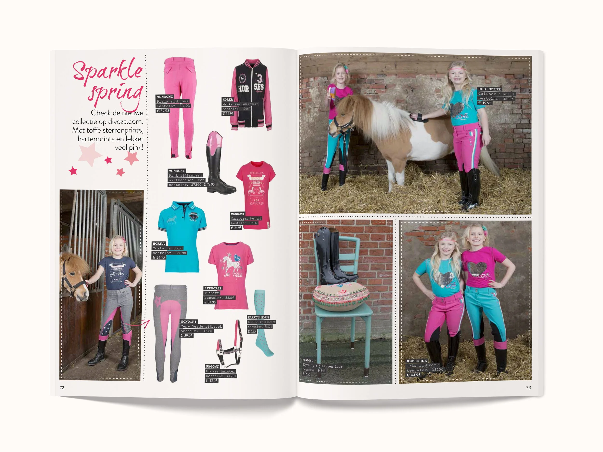 Bij Divoza kan je alles kopen voor je paard en de paardensport. In een magazine worden de nieuwste items belicht en vind je de bestelnummers en de prijzen. Van catalogus naar magazine. Met soms kleine en soms grote stapjes/stappen in de richting van een inspiratief magazine, van 116 pagina’s, waar je graag doorheen bladert.