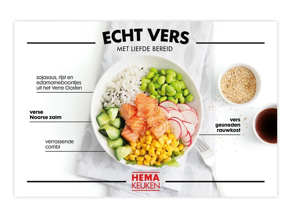 ‘HEMA keuken’ is het restaurant van HEMA. Daar kan je uitgebreid lunchen en dineren en dat allemaal nét even luxer dan in het café van HEMA. Het heeft een hele eigen uitstraling, met een eigen interieur en daarbij behorende sfeerplaten. Deze platen geven informatie over de gerechten en zorgen ervoor dat het er smakelijk uit ziet. Je krijgt als klant informatie, maar je krijgt vooral trek.